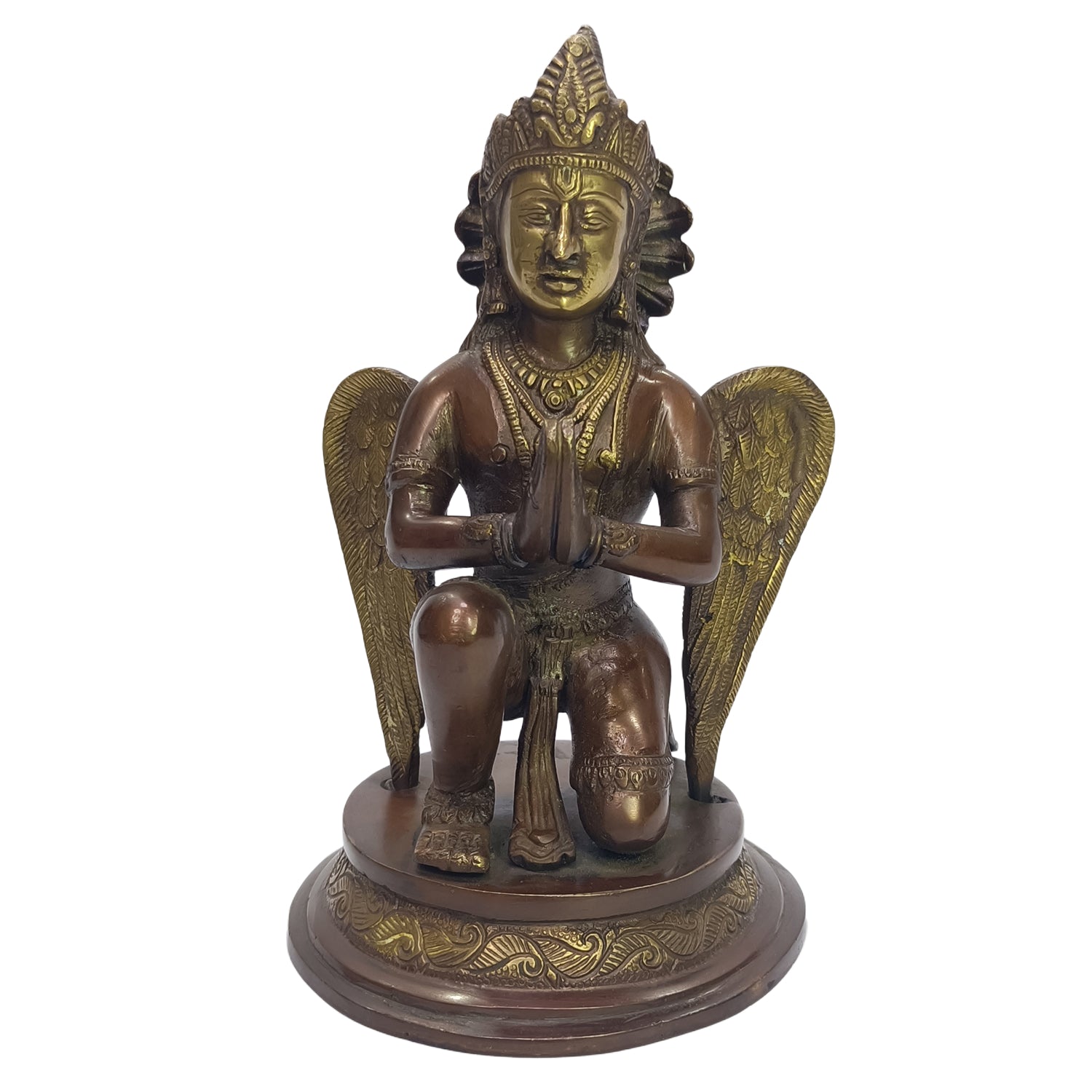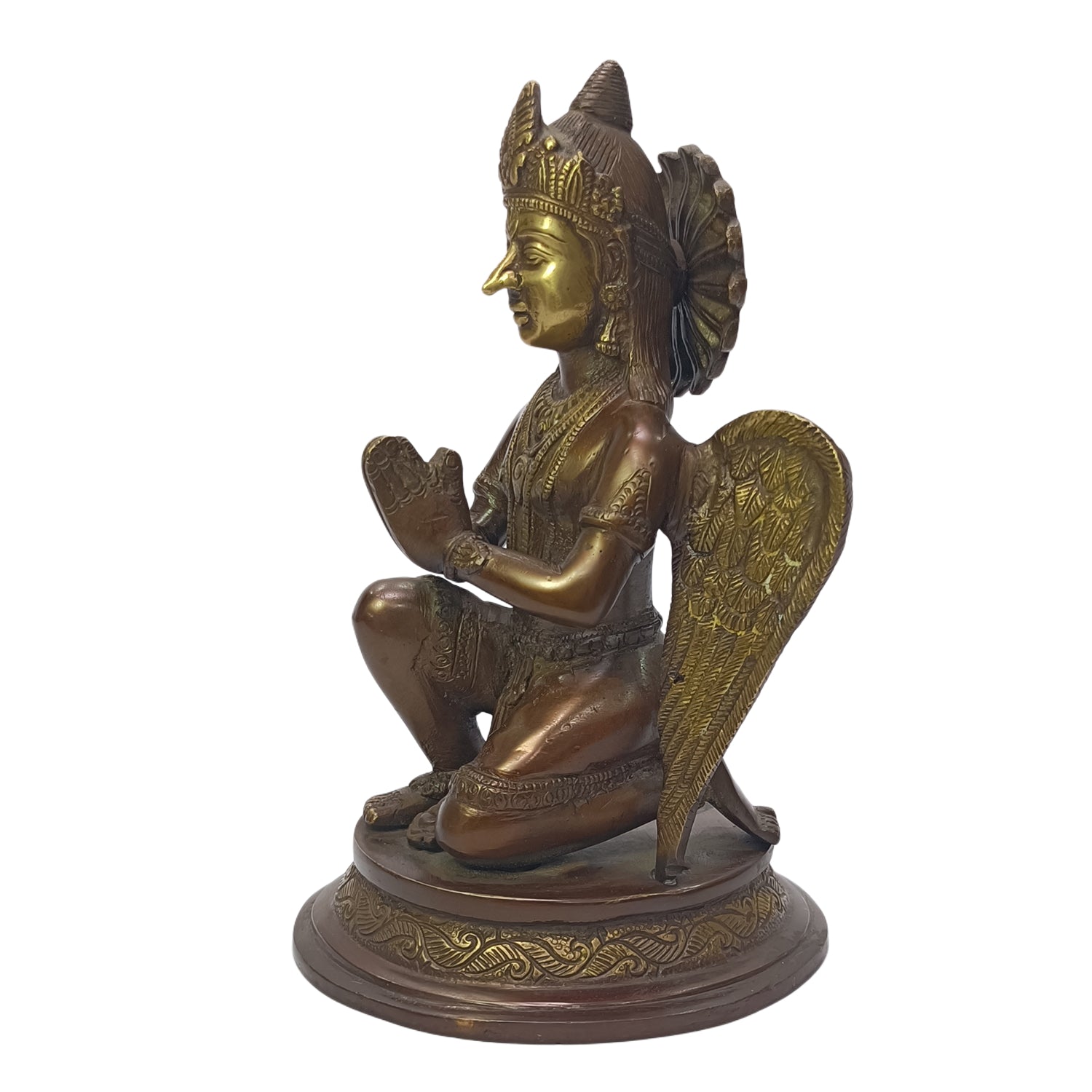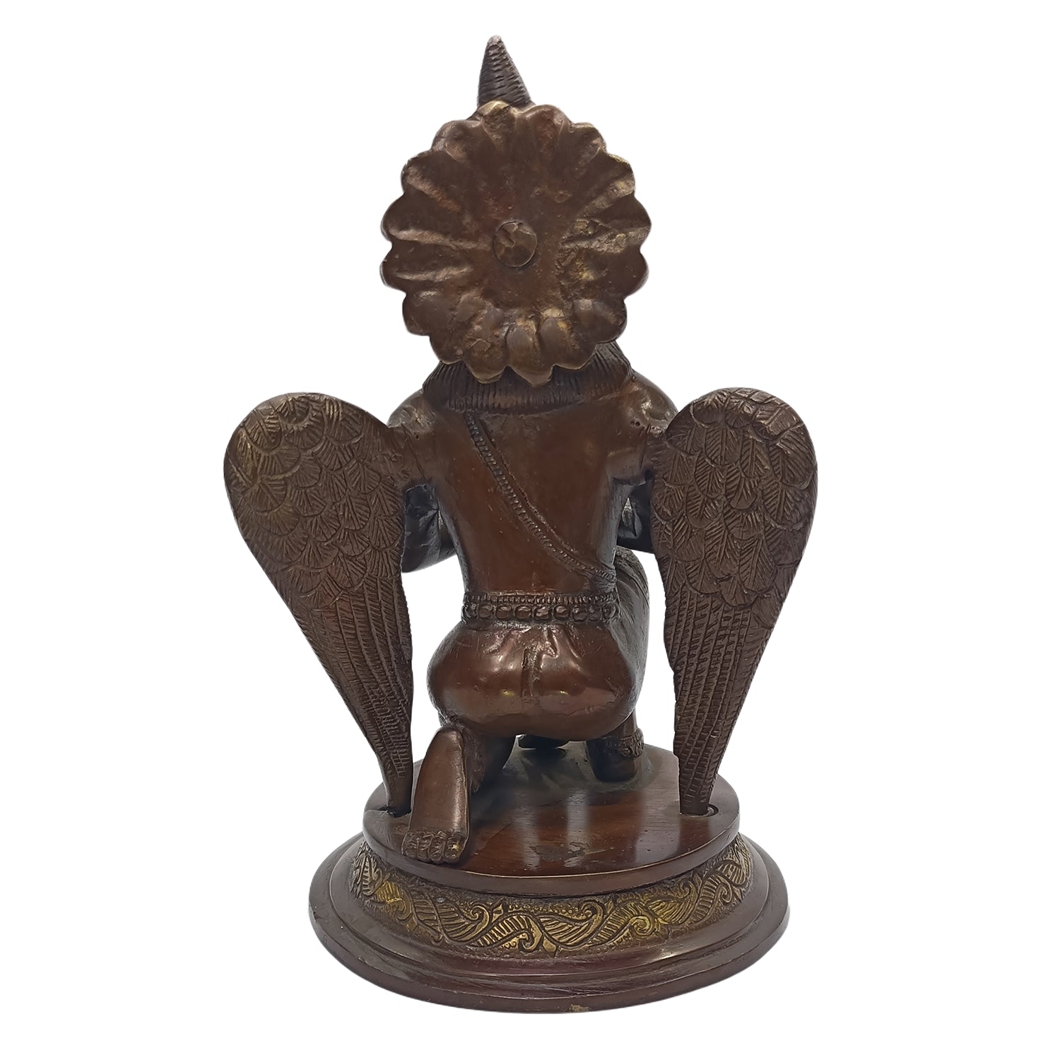 The Handmade Brass Garudan Sitting (Chocolate Colour) idol is a striking representation of Garuda, the revered mount of Lord Vishnu, symbolizing devotion, protection, and divine strength. Finished in a rich chocolate-toned polish, this beautifully handcrafted idol features Garuda seated in a posture of prayer or readiness, with hands folded in reverence and wings elegantly detailed. Made from high-quality brass using traditional techniques, the sculpture reflects refined craftsmanship and spiritual significance. A special piece from Cholan Arts Emporium, it is ideal for home altars, temples, or as a symbolic decorative item, inviting courage, humility, and divine protection into any sacred or living space.