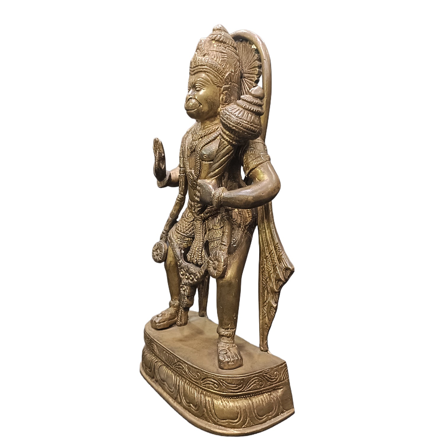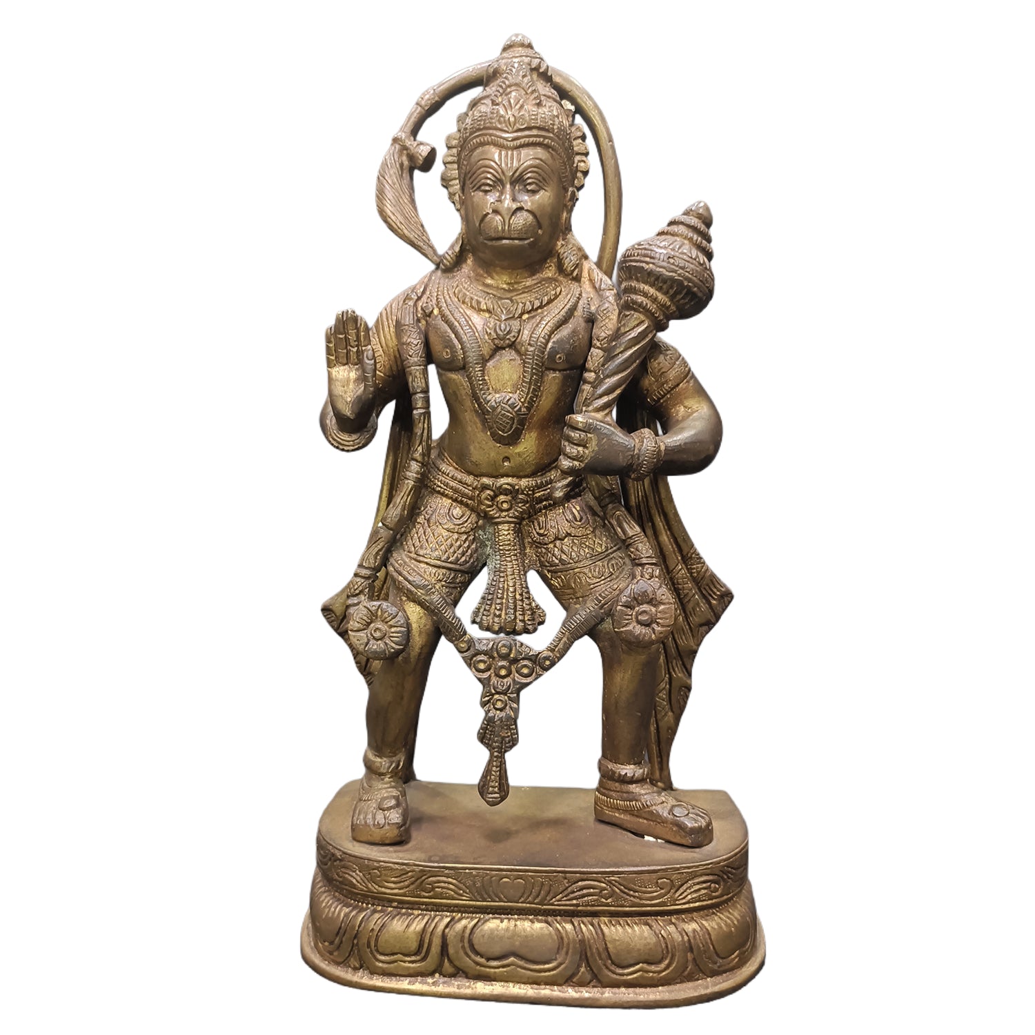 The Handmade Brass Hanuman Standing idol is a powerful representation of Lord Hanuman’s unwavering devotion, courage, and strength. Sculpted with precision from high-quality brass, this idol captures Hanuman in a commanding upright posture, symbolizing readiness to protect and serve. The intricate detailing in his facial expression, attire, and divine weapons reflects traditional craftsmanship and spiritual significance. Ideal for home altars, temples, or sacred spaces, this idol invites protection, fearlessness, and positive energy. A signature piece from Cholan Arts Emporium, it stands out for its superior quality and artistic authenticity, making it a meaningful addition to any spiritual collection.