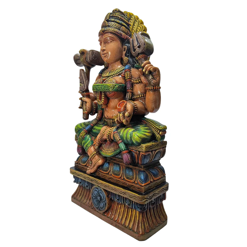 Welcome abundance and divine grace into your home with this vibrant Lakshmi idol, beautifully handmade in wood and adorned with rich, traditional colors. Depicting Goddess Lakshmi, the embodiment of wealth, prosperity, and well-being, this idol features intricate detailing and a radiant finish that enhances its spiritual and aesthetic appeal. Expertly crafted by skilled artisans, it reflects devotion and artistry in every detail. Perfect for pooja rooms, festive decor, or gifting, this colorful wooden idol brings blessings, beauty, and positive energy to any space.