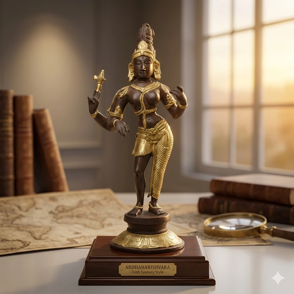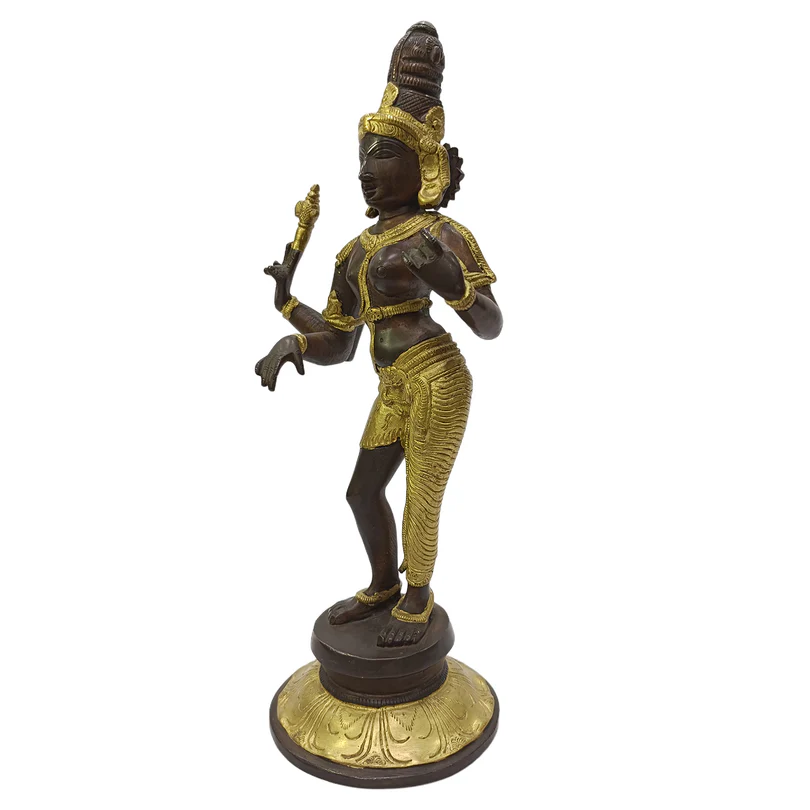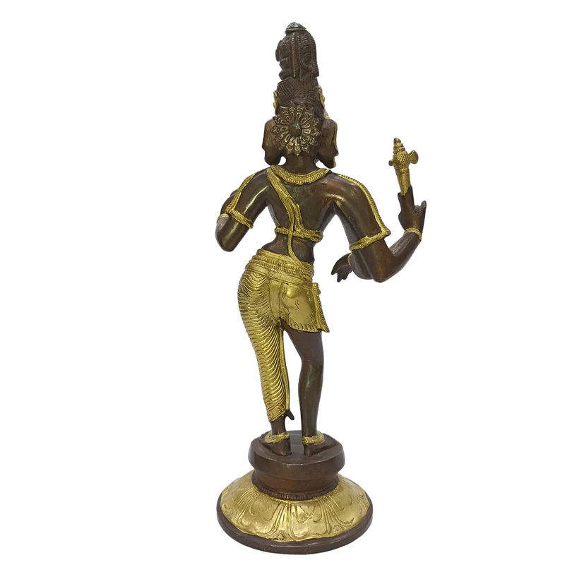 The Handmade Brass Arthanareeswarar (Double Colour) idol is a divine representation of Lord Shiva and Goddess Parvati in a single unified form, symbolizing the perfect balance of masculine and feminine energies, creation and harmony. Crafted from high-quality brass and finished in an elegant double-colour polish, this sculpture showcases intricate detailing from Shiva's matted locks and trident to Parvatis graceful ornaments and serene expression. The dual-tone finish enhances the visual depth and spiritual significance of this sacred form. A masterful creation from Cholan Arts Emporium, this idol is ideal for home altars, temples, or as a thoughtful spiritual gift, inviting balance, unity, and divine grace into any space.