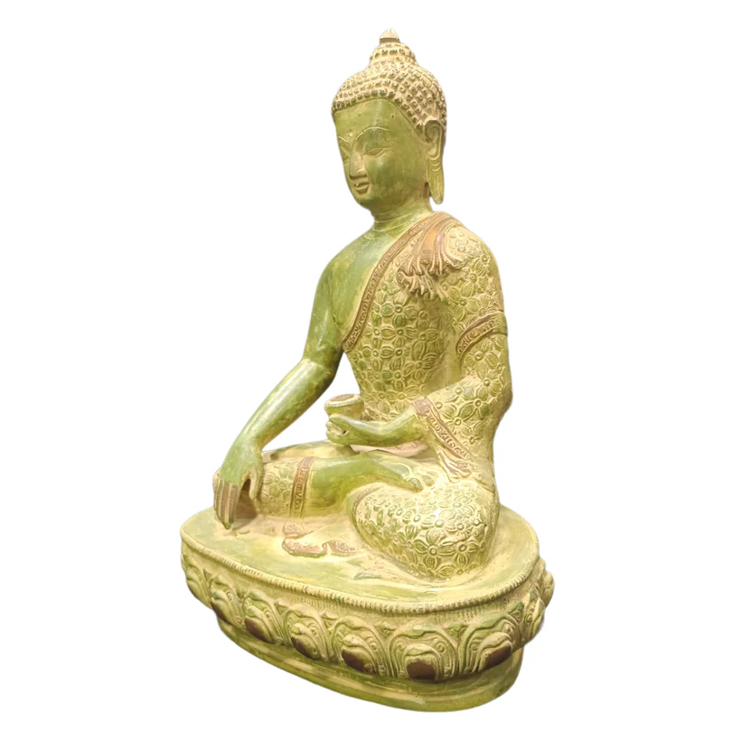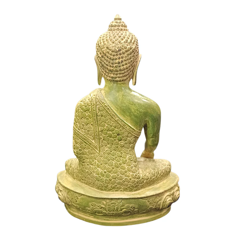 The Handmade Brass Buddha Sitting (Green Colour) idol is a serene and visually soothing representation of Lord Buddha, symbolizing peace, enlightenment, and spiritual harmony. Finished in a calming green hue, this finely crafted brass sculpture features intricate detailing in Buddhas robes, facial expression, and meditative posture, evoking a sense of balance and mindfulness. Seated in the traditional Dhyana Mudra, this form of Buddha inspires inner stillness and contemplation. A distinguished creation from Cholan Arts Emporium, it is ideal for home altars, meditation spaces, or as a tranquil decor piece, inviting positivity, clarity, and sacred energy into any environment.