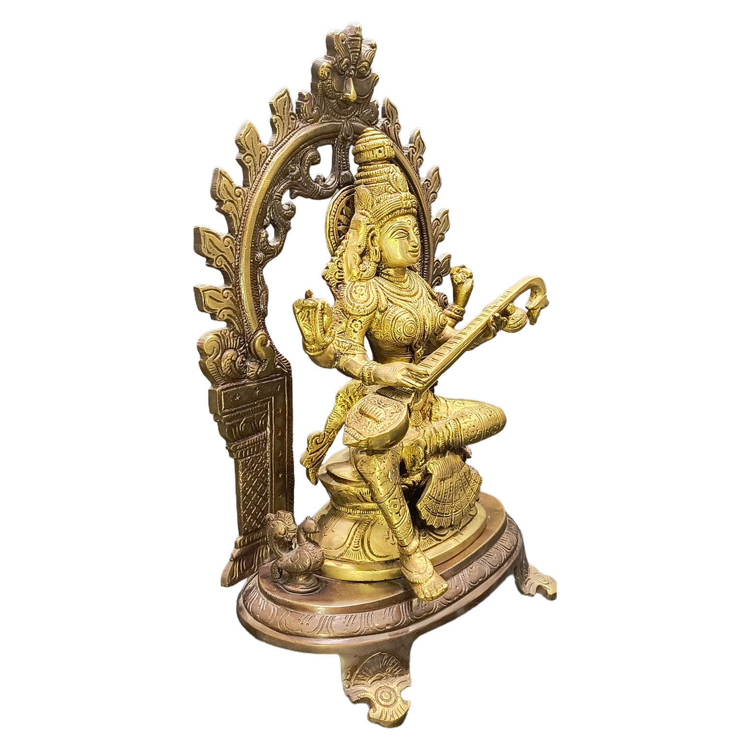 This radiant idol of Goddess Saraswati, adorned in a mesmerizing double-color finish, embodies spiritual beauty and higher wisdom. With her veena and scriptures, she symbolizes the harmony between knowledge and creativity. Crafted by skilled artisans using high-grade brass, the idol features detailed carvings and a serene aura that fills any space with peace and intellect. Whether for your pooja room, as home decor, or a sacred gift, this masterpiece carries divine energy and lasting elegance. Let Saraswati’s blessings flow through your life