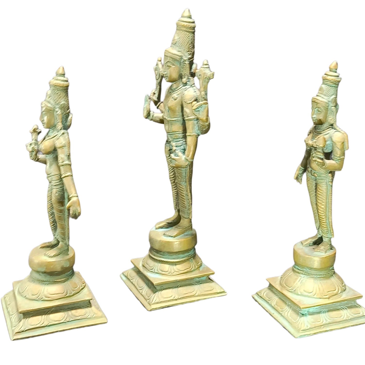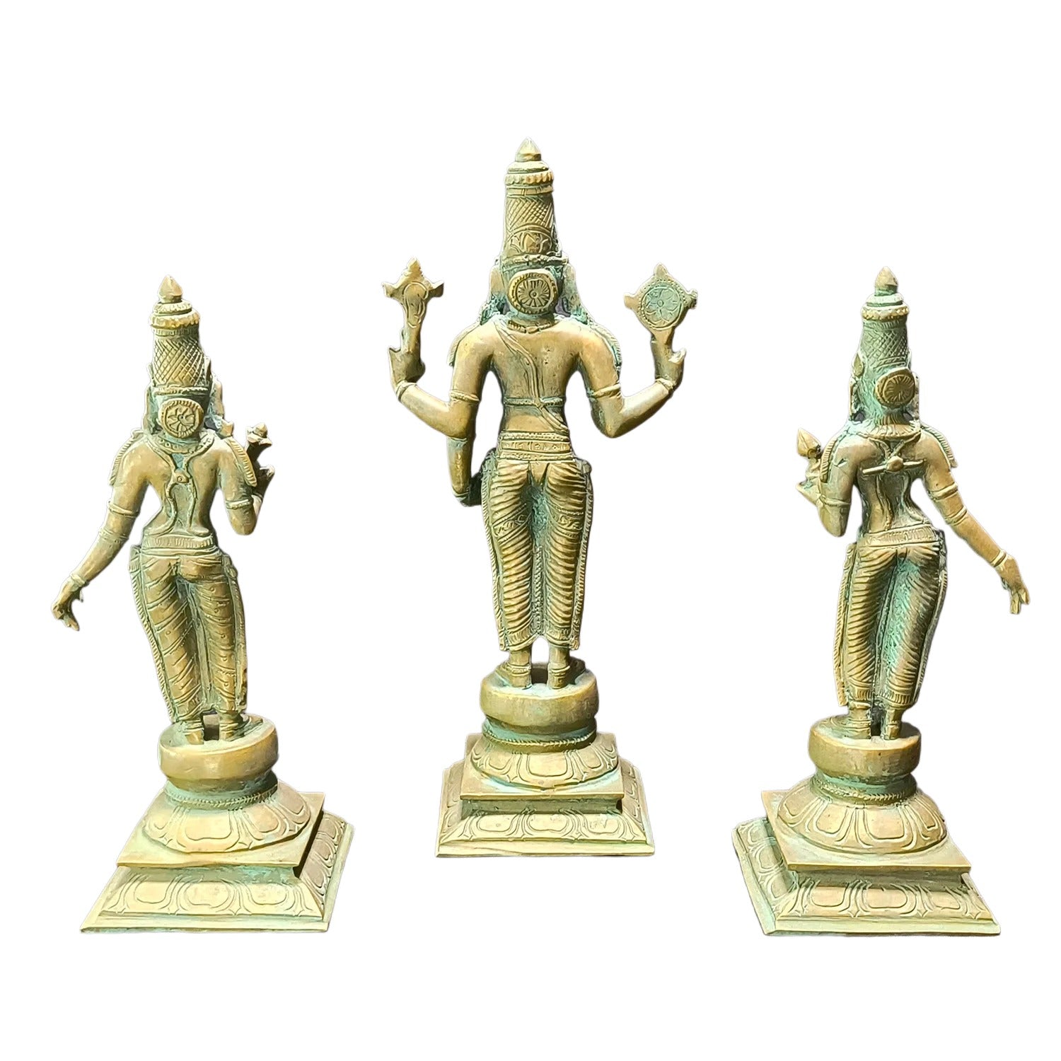 Invite divine blessings with this Handmade Bronze Vishnu, Sridevi & Boodevi Statue, a celestial symbol of protection, wealth, and harmony. Vishnu, the preserver of the universe, stands gracefully beside Sridevi (Goddess of Prosperity) and Boodevi (Goddess of Earth), radiating cosmic balance. Crafted with intricate detail, this statue is perfect for home altars, temples, or meditation spaces, channeling peace and abundance. Whether for worship, devotion, or as a statement of sacred art, this masterpiece embodies spiritual grace and eternal stability.