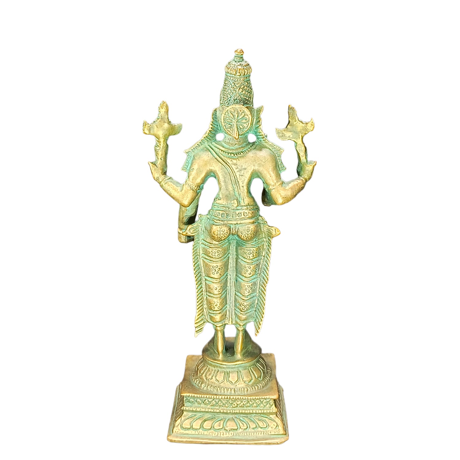 Invite the divine presence of Lord Vishnu, the supreme preserver and protector of the universe, with this Handmade Bronze Vishnu Standing idol. Depicted in a majestic upright posture, this sculpture symbolizes cosmic balance, dharma, and divine blessings. Crafted using the traditional lost-wax casting technique, the idol showcases intricate detailing, from Vishnu’s sacred conch and discus to his finely adorned attire. Made from high-quality panchaloha (five-metal alloy), this idol is ideal for home altars, temples, or meditation spaces, bringing stability, peace, and prosperity into your life.